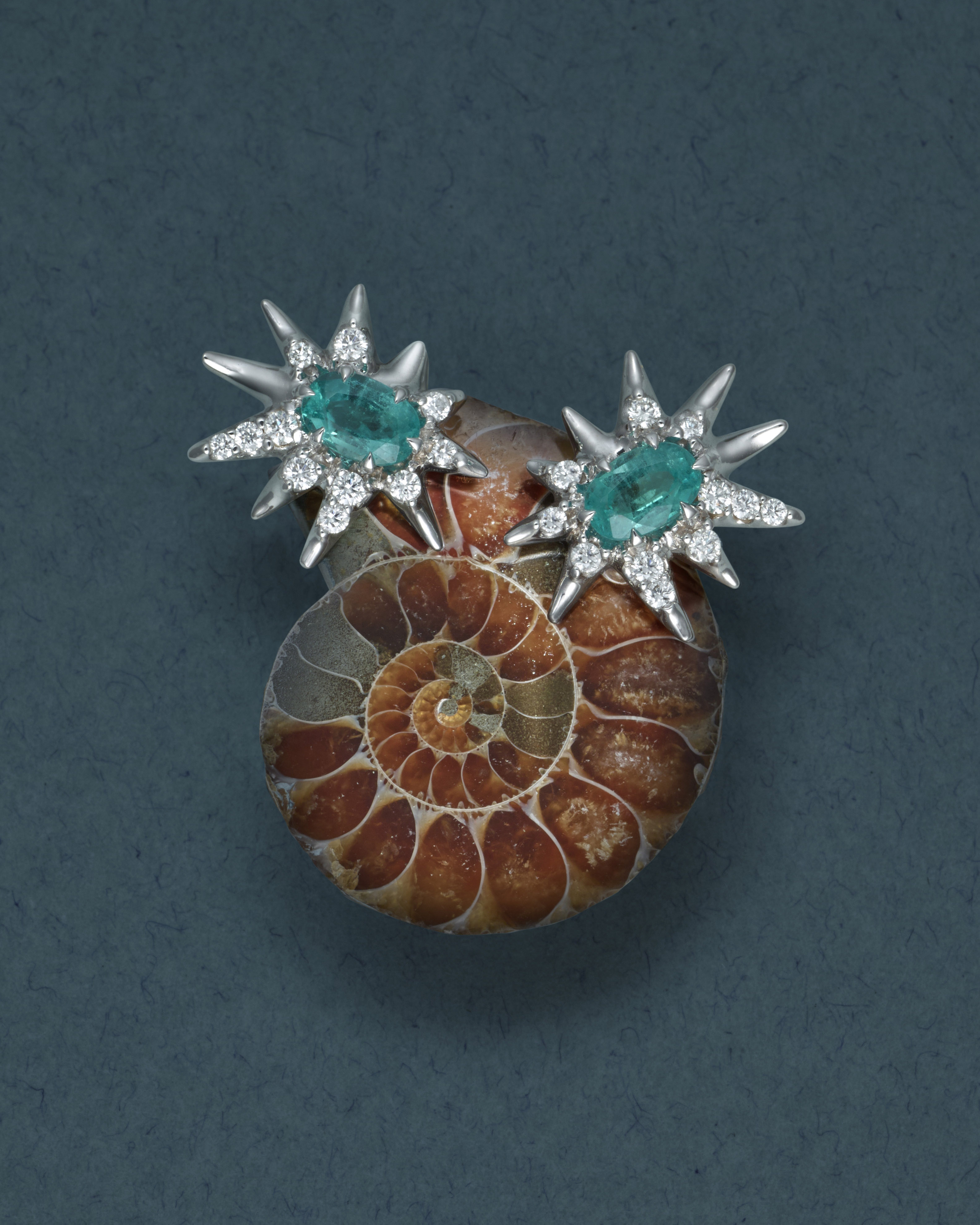 Em certas regiões o mar também se revela em tons de verde, um reflexo da respiração da Terra em movimento. Dessas matizes nascem as joias de esmeralda da coleção Mar de Voltas, onde o verde hipnótico dessas pedras, emoldurado por diamantes e ouro branco 18K, remete às estrelas do mar — símbolos de regeneração e equilíbrio na vida marinha.