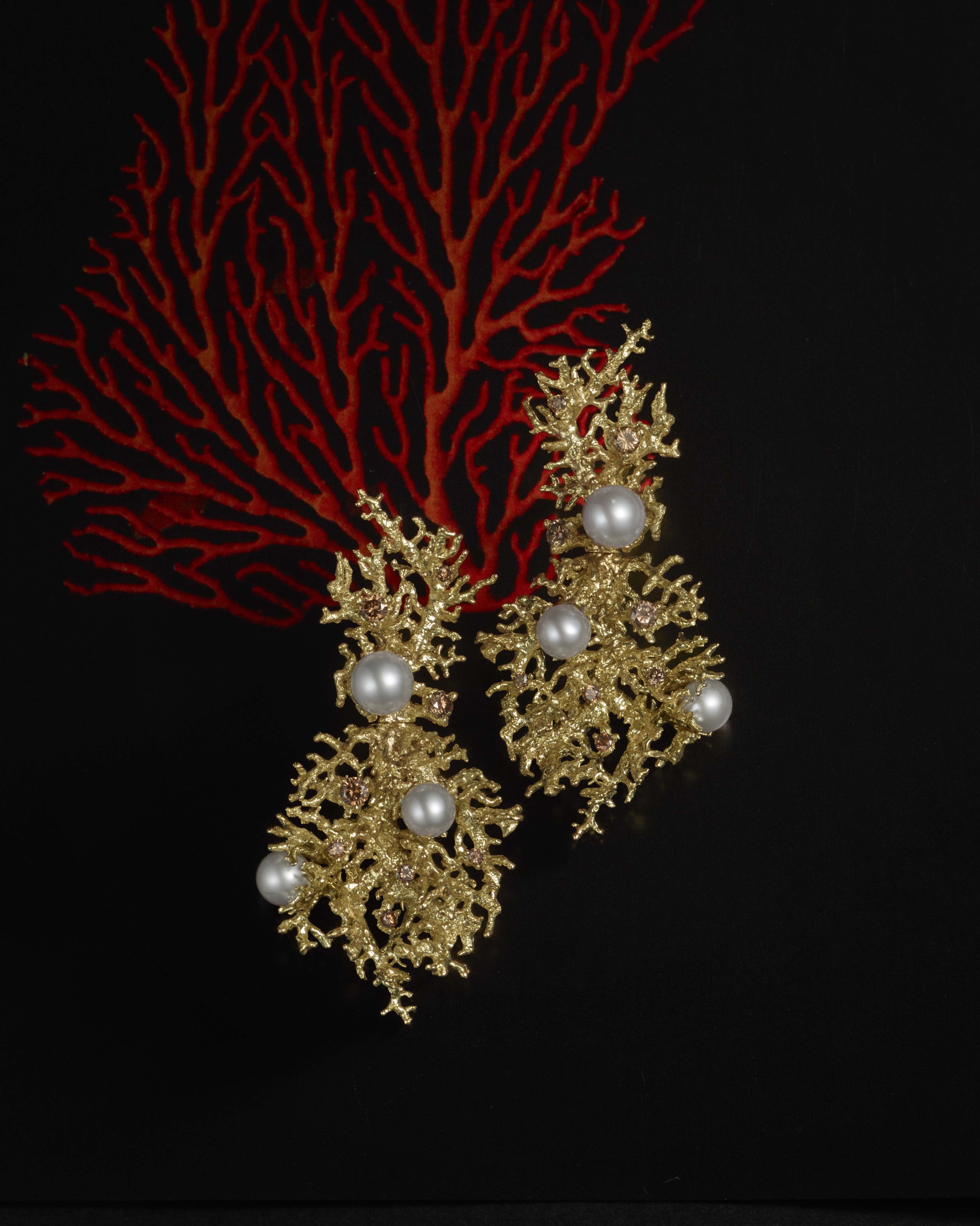O dourado das marés reflete a energia solar que sustenta o todo. Inspiradas na rica textura dos corais, as joias da coleção Mar de Voltas revelam formas orgânicas em ouro amarelo 18K, onde pérolas acinzentadas surgem como bolhas d’água ou delicados resquícios de espuma sobre as ramificações douradas.